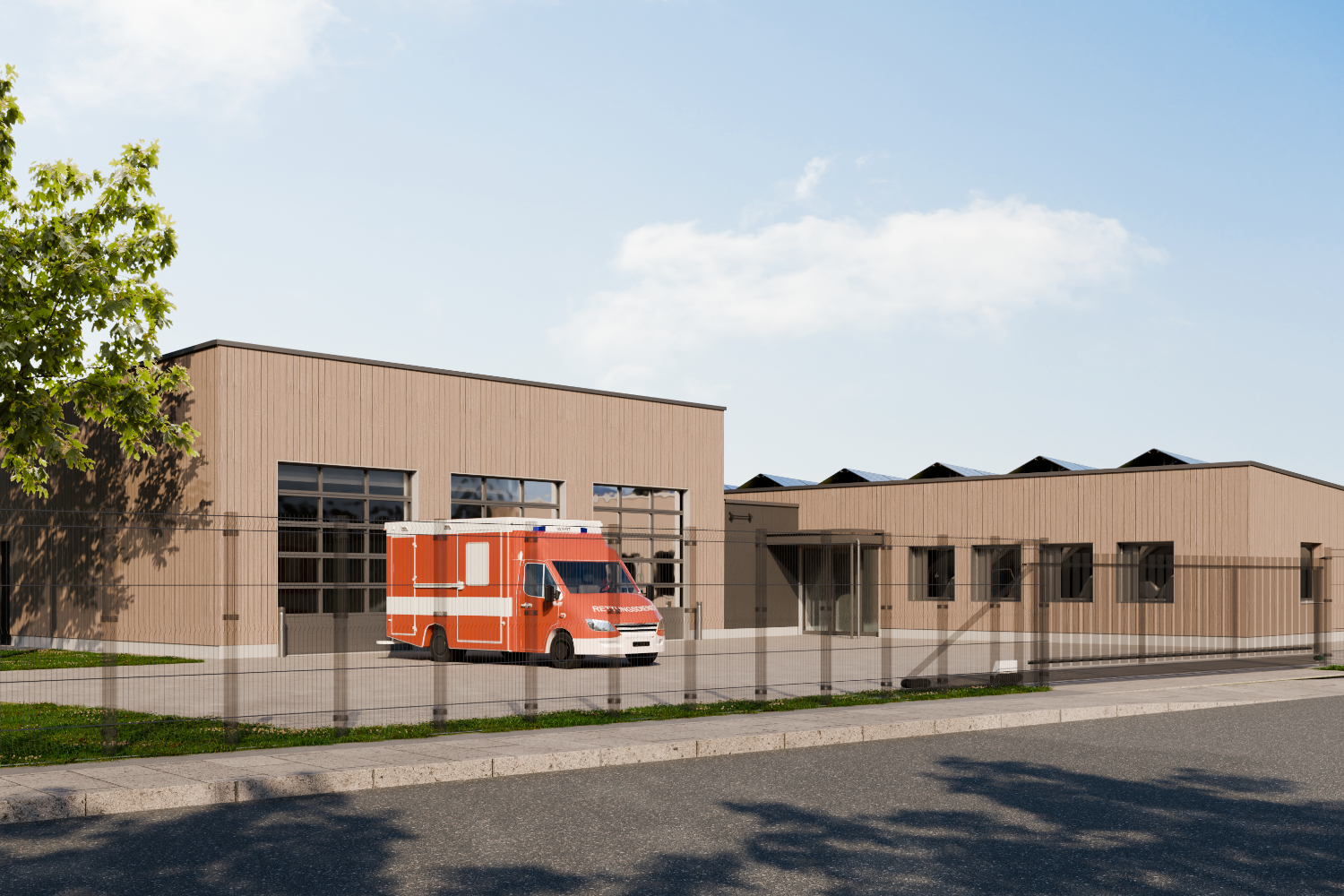 Neubau einer Rettungswache, Fahrzeughalle mit drei Stellplätzen, Alarmzentrale, Verwaltungs- und Sozialräumen, Lagerbereich, Sanitär- und Dekontaminationsbereiche. Das Gebäude wird nach dem Standard des „Bewertungssystem Nachhaltiges Bauen“ des Bundes geplant. Holz als primärer Baustoff, Gründach, Photovoltaikanlage